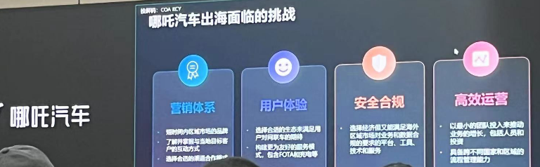 总而言之,对于出海企业来说,面临的挑战除了政策上的拦路虎,还包括建立营销体系、用户体验、安全合规和高效运营。当前,汽车出海面临着激烈的市场竞争,如何在短时间内构建创新解决方案,为海外消费者提供更加智能化与网联化的驾乘体验,实现安全合规,并快速提升品牌认知度与市场认可度,也是哪吒汽车面临的主要挑战。