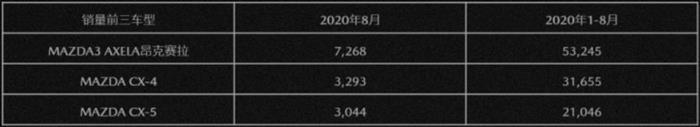 与去年相比,阿特兹退出数据公布行列。目前公布的三款车型为AXELA昂克赛拉、CX-4和CX-5,8月销量分别为7268辆、3293辆和3044辆,而1-8月的累计销量分别为53245辆、31655辆和21046辆。