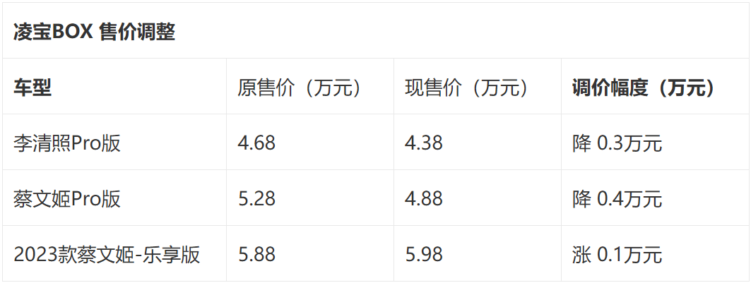 凌宝BOX调价车型涉及三款,降幅为1000-4000元。其中,李清照Pro版售价从4.68万元调整至4.38万元,蔡文姬Pro版售价从5.28万元调整至4.88万元,2023款蔡文姬-乐享版售价从5.88万元调整至5.98万元。另外,2022款李清照版、2022款蔡文姬L版、2022款卓文君版、2022款李清照Pro版停产停售。