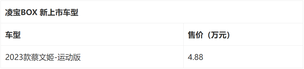 新上市的2023款凌宝BOX蔡文姬-运动版,售价与蔡文姬Pro版相同,均为4.88万元,该车型CLTC续航里程205km,慢充时间7-9小时,拥有7寸液晶仪表盘、9寸中控屏,并配备导航、蓝牙、语音控制、手机互联、倒车影像等配置。