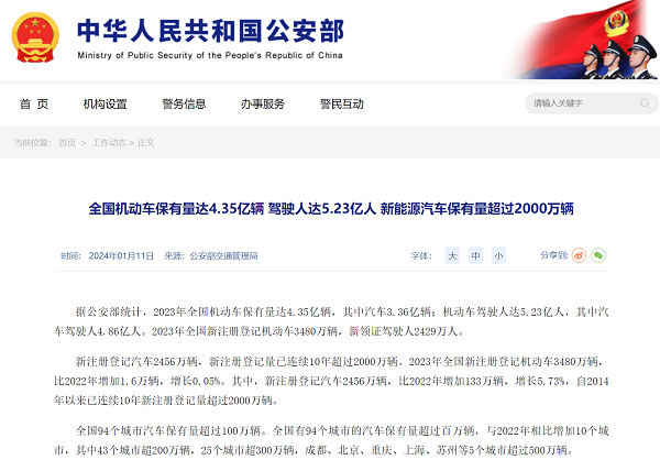中国经济网1月12日讯(记者 郭跃)昨日,公安部发布数据显示,2023年全国机动车保有量达4.35亿辆,其中汽车3.36亿辆,新能源汽车2041万辆;机动车驾驶人达5.23亿人,其中汽车驾驶人4.86亿人,占驾驶人总数92.92%;全国新注册登记机动车3480万辆。