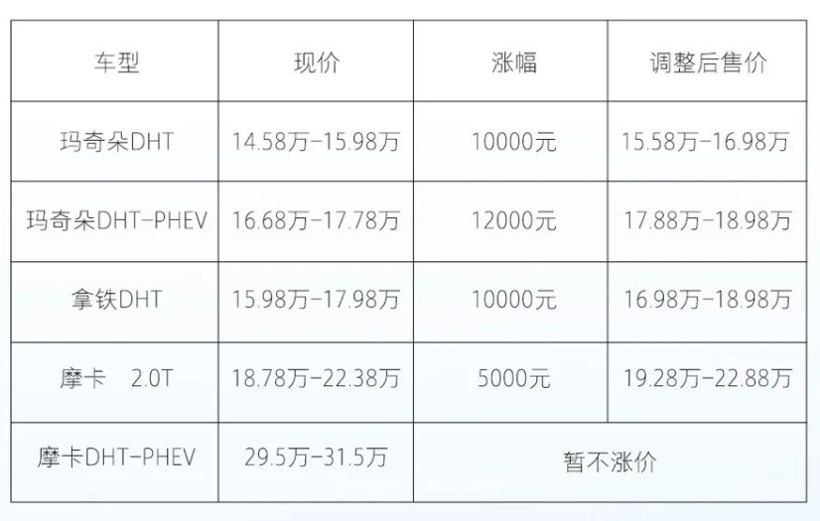 具体来看,玛奇朵DHT和拿铁DHT上涨1万元,调整后售价分别为15.58-16.98万元和16.98-18.98万元;玛奇朵DHT-PHEV上涨1.2万元,调整后售价为17.88-18.98万元;摩卡2.0T上涨5000元,调整后售价为19.28-22.88万元。而刚刚于3月初上市的摩卡DHT-PHEV暂不涨价。