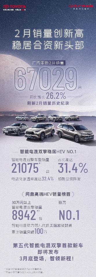 2月车市整体回暖,各大车企动作频频,鏖战正酣,电动化市场开启厮杀模式。作为合资车企看点最大的选手,广汽丰田扛下市场重压,2月销量67029台,同比劲增26.2%,刷新2月销量历史纪录,成唯一两位数正增长的主流合资车企,以遥遥领先的头部优势位列日系第一,稳居合资新头部。