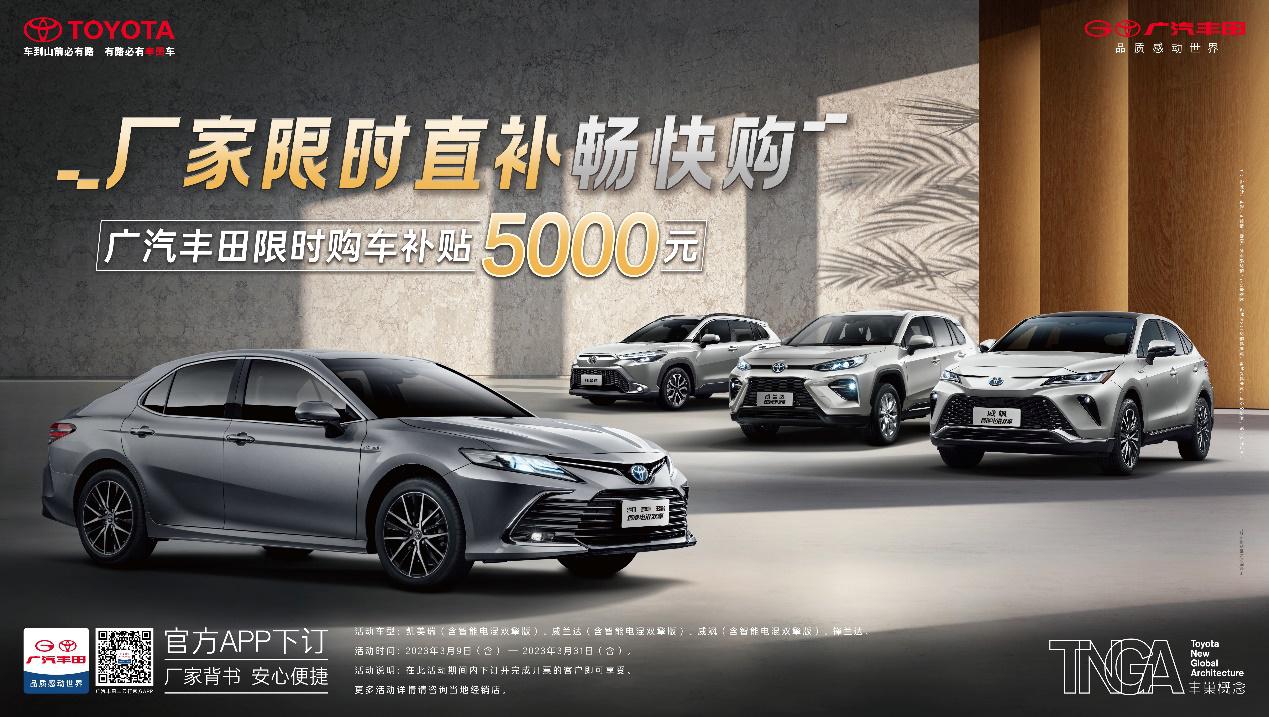 与此同时,为了响应政企联合刺激消费以及回馈超700万用户的喜爱与信赖,广汽丰田推出了高达5000元起的限时购车补贴,按下经济复苏“快进键”。即日起至3月31日,购买凯美瑞、威兰达、威飒、锋兰达等明星车型即可畅享厂家限时直补,让广大消费者轻松进阶“有车一族”!(具体详情请咨询当地经销店)