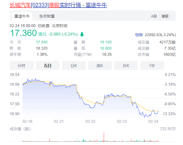 也正基于长城汽车在俄罗斯本地的深度布局,2月24日当天长城汽车(HK.2333)收跌5.24%,盘中触及每股16.8港元,为去年6月以来新低。