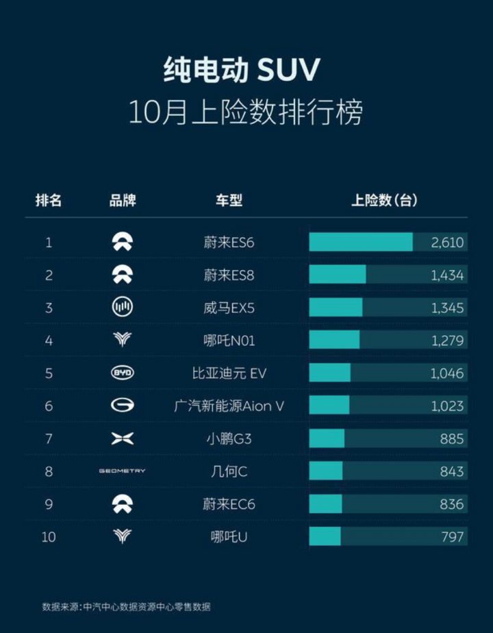 根据中国汽车技术研究中心于11月10日公布的国内车市上险数据,显示2020年10月蔚来品牌整体上险数达4880辆,同比上涨94%,接近翻番。纯电SUV销量前十榜单中,蔚来拿下三席,ES6和ES8包揽冠亚军,三款车型均实现交付即热销。而蔚来ES6已经连续13个月蝉联纯电SUV冠军。