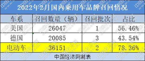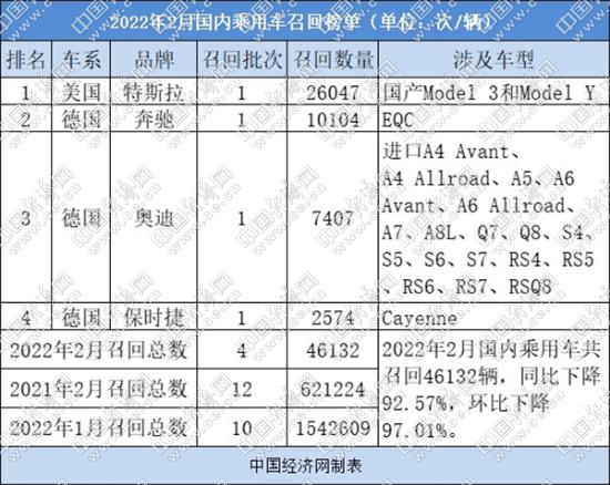 根据国家市场监督管理总局缺陷产品管理中心2月发布的召回公告,中国经济网汽车频道经过汇总、统计,整理出“2022年2月国内乘用车召回榜单”。2月,共有4个汽车品牌累计发布3起公告,共计召回乘用车46132辆,同比下降92.57%,环比下降97.01%。