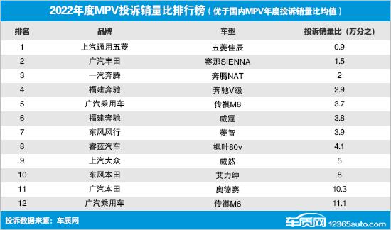 据国内领先的缺陷汽车产品信息收集平台车质网的统计数据显示,2022年国内汽车年度投诉销量比均值为万分之38,数值较2021年大幅提升,一定程度上反映出汽车整体口碑出现转差迹象。其中, MPV投诉销量比年度均值为万分之11.4,表现明显好于汽车整体水平。据乘联会数据显示,2022年MPV累计销量共770,302辆,其中有销量数据的车型共55款,由此得出SUV年销量平均值为14,005辆。据统计,2022年共有15款车型超过了MPV年销量平均值,其中12款车型因投诉销量比表现优于MPV投诉销量比年度均值而入选榜单,具体排名如下: